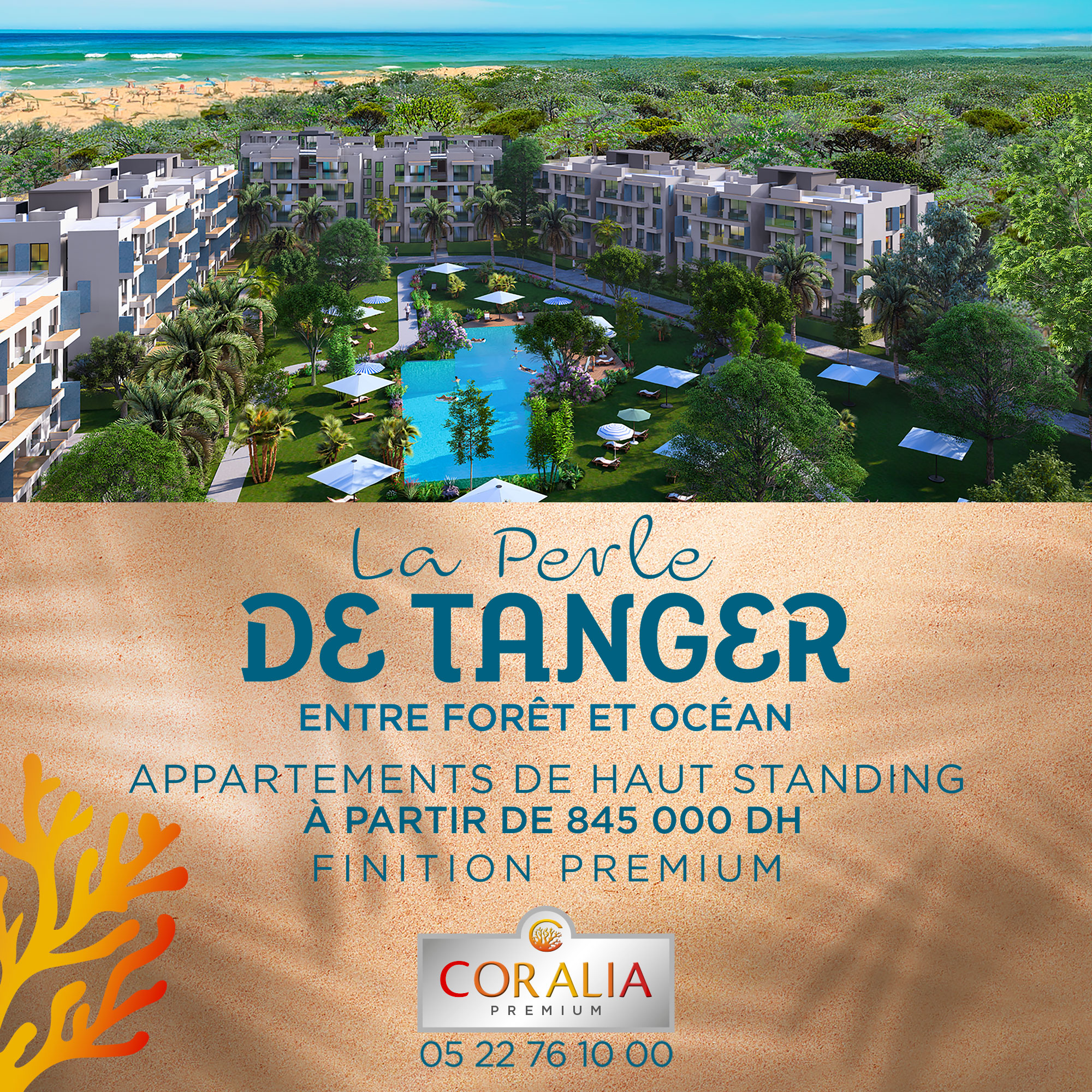 LA PERLE DE TANGER, le nouveau projet lancé par la marque Coralia à Tanger, est un complexe résidentiel en R+3 avec ascenseur et parking sous-sol entre forêt et océan, dans un environnement connecté à la nature.