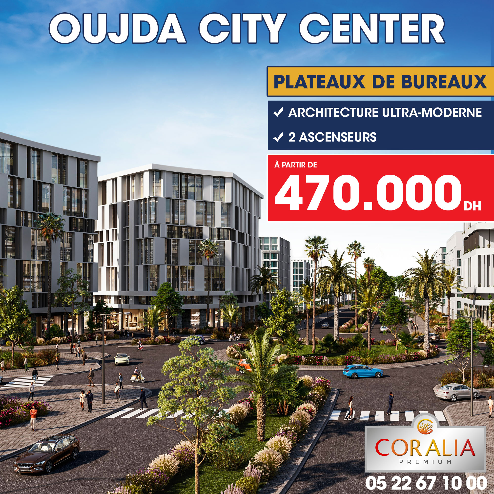 Situé à proximité immédiate du quartier administratif et des principales entités vitales et économiques de la ville, OUJDA CITY CENTER c’est aussi des plateaux de bureaux ultra-modernes, dans un immeuble en R+10 avec ascenseurs, donnant sur les grands boulevards, et offrant ainsi une opportunité unique pour développer votre activité.
